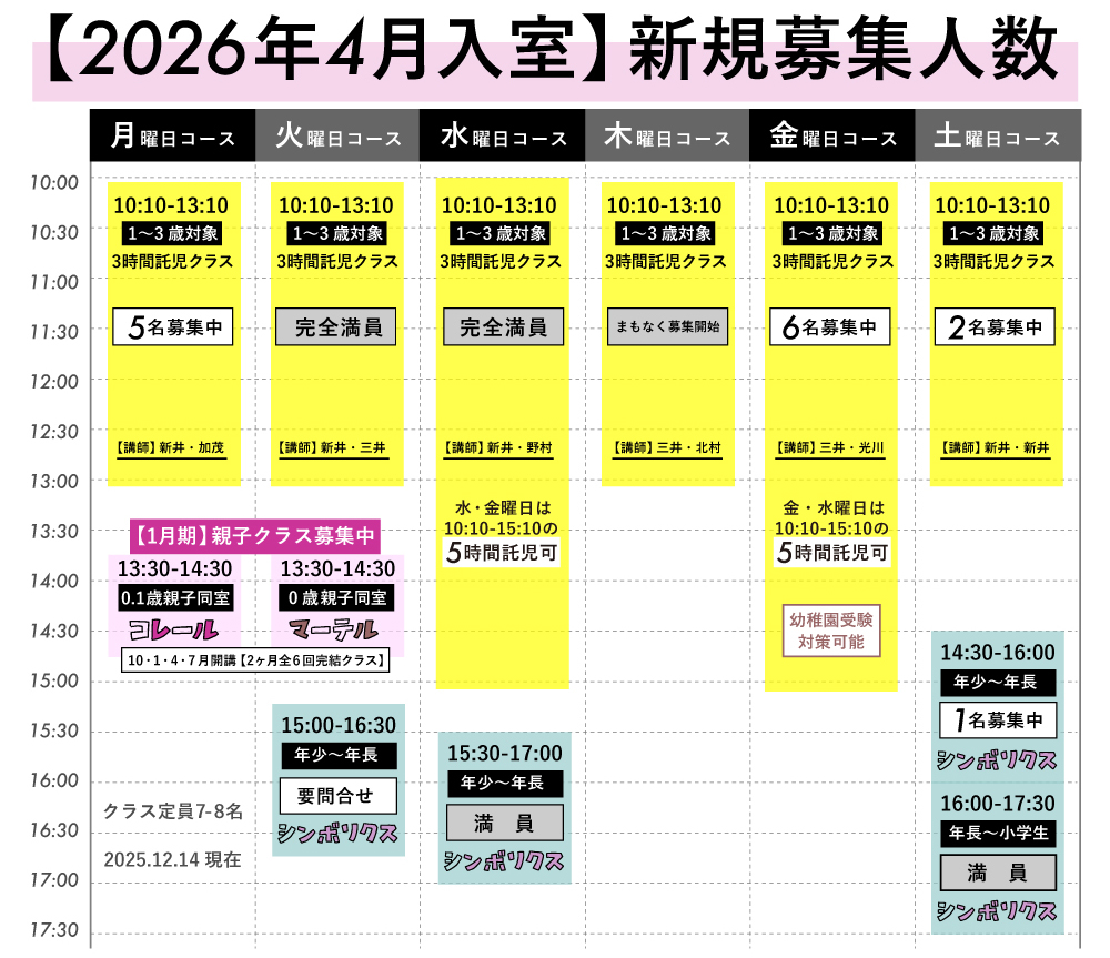 対 象:2023年4月2日~2025年生まれ対象/入室時に歩行なお子様(3時間託児型クラス)/4歳年少〜小学生(1時間半クラス)