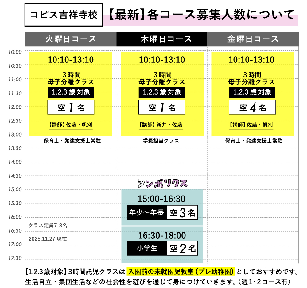 お問合せLINE:https://lin.ee/zW847uk(友達追加にメッセージ送信ください) 【教室について】教室内は授乳・ミルク・お菓子等のお子様の飲食は自由です。オムツ替えは教室隣がお手洗いとなっておりますので、ご利用ください。