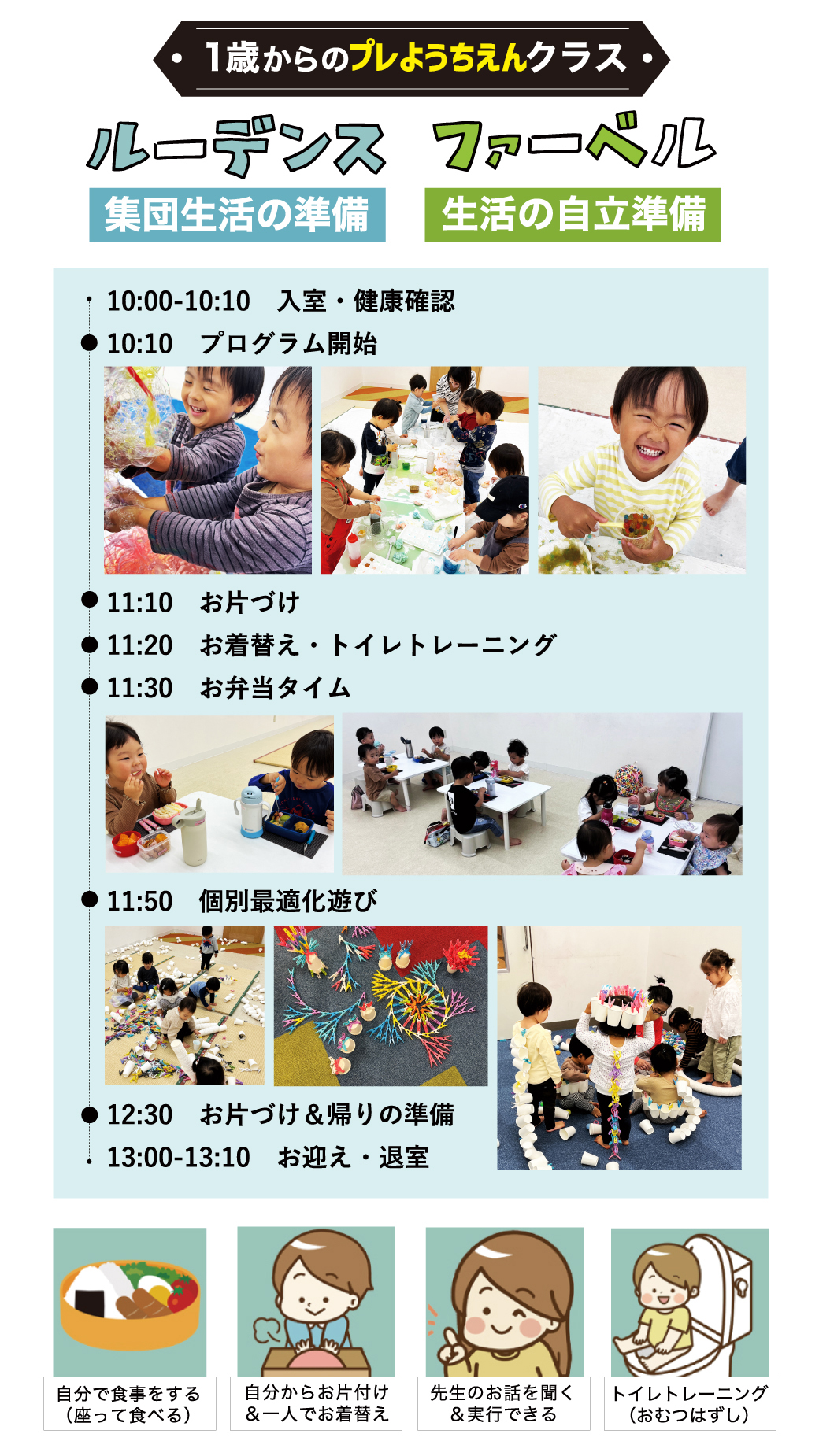 歩き始めた1歳から幼稚園入園前の「ルーデンス・ファーベル」は【3時間の母子分離クラス】です。